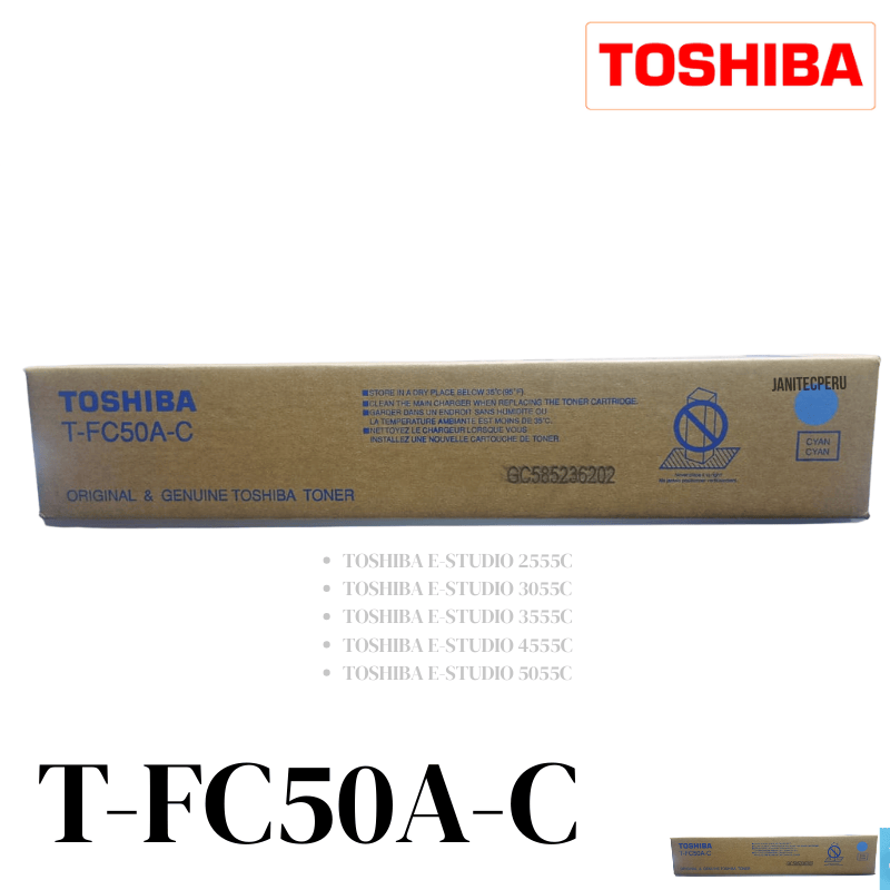 “Tóner Toshiba T-FC50A-C original para e-Studio 2555C, 3055C, 3555C, 4555C y 5055C. Rendimiento de hasta 28,000 páginas. Calidad profesional garantizada.”